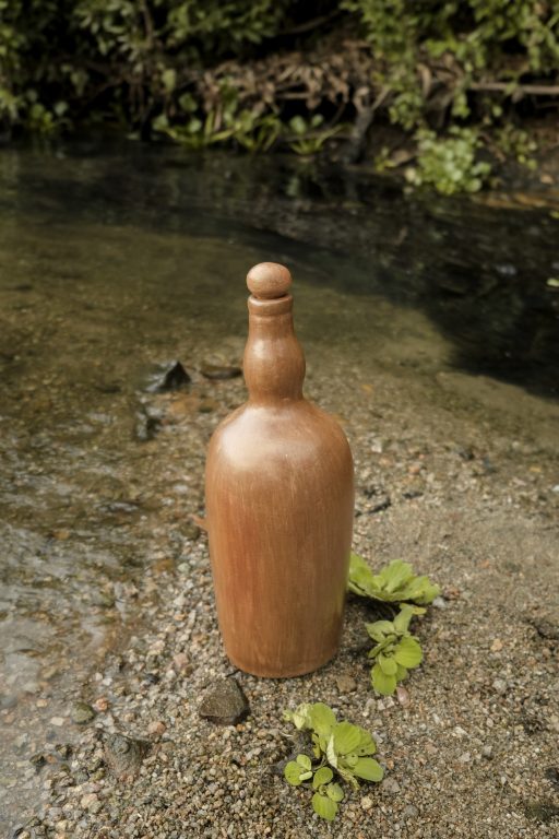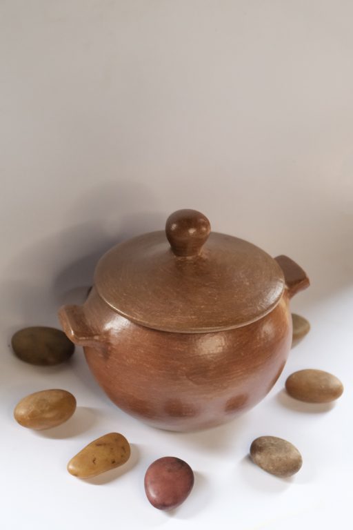 Na “Casa de Barro”, ateliê de produção no centro da comunidade, são realizadas as etapas de tratamento da argila, coletada nas “veias de barro” do próprio território: a mistura com a areia que retiram de uma pedra arenosa; o molde manual das peças, secagem, lixamento e o polimento com pedra seixo e óleo vegetal, que garante o brilho surpreendente das peças. As queimas são feitas em fornos artesanais de alta temperatura, e todo processo pode chegar a 20 dias.